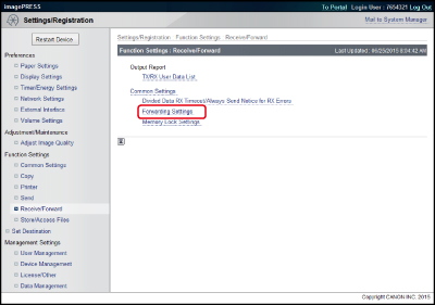 Forwarding Settings: | Especifiqueu les opcions necessàries per reenviar documents, com ara el nom del document i el format de fitxer. Seleccioneu el format de fitxer del document reenviat a la llista. Si voleu dividir el document en pàgines diferents abans d'enviar-lo, seleccioneu [Divide into Pages]. Si voleu especificar el moment en què s'activa el reenviament, seleccioneu [Specify Forwarding Time]. Si voleu activar el reenviament cada dia, seleccioneu [Everyday] → especifiqueu les hores d'inici i de finalització. Si voleu activar el reenviament només determinats dies, seleccioneu [Especificar període] → especifiqueu el dia, l'hora d'inici i l'hora de finalització per activar el reenviament. Si voleu que s'enviï un avís de confirmació sempre que el reenviament finalitzi correctament, seleccioneu [Forwarding Done Notice] → feu clic a [Select Destination] → seleccioneu la destinació per a l'avís de confirmació. Si voleu que s'enviï un avís només quan s'hagi produït un error, seleccioneu [Notice Only for Errors]. Si voleu imprimir els documents que s'han de reenviar o desar a la memòria, seleccioneu [Store/Print Received File]. |