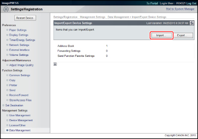 Si importeu les opcions del dispositiu, la llista d'adreces també s'importa, i això provoca que les destinacions desades s'eliminin i se sobreescriguin amb les destinacions del fitxer importat. L'equip s'ha de reiniciar per activar les opcions del dispositiu importades. Després de portar a terme la importació, apagueu l'alimentació principal de l'equip i tot seguit torneu-la a encendre. Després de portar a terme la importació de les opcions del dispositiu, l'IU remot no es pot utilitzar per portar a terme altres operacions fins que l'equip s'hagi reiniciat. Apagueu l'alimentació principal de l'equip i tot seguit torneu-la a encendre. Si la dada exportada des d'aquest equip s'importa a un equip d'un model diferent, no s'actualitzen les [Opcions favorites] al tauler de control. Si especifiqueu l'adreça a la llibreta d'adreces remota com a destinació de reenviament, les opcions de reenviament no s'importaran. Tanmateix, si l'equip que exporta informació d'opcions i l'equip de destinació per a la importació utilitzen la mateixa llibreta d'adreces remota, les opcions de reenviament es poden utilitzar a l'equip de destinació per a la importació. Per obtenir més informació sobre la Llibreta d'adreces remota, vegeu (Vegeu "Especificació de destinacions mitjançant la llibreta d'adreces (remota)".) |