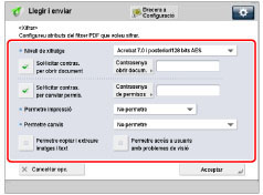 Nivell de xifratge | Seleccioneu la versió de PDF per al qual vulgueu establir el nivell de xifratge. Podeu seleccionar una de les opcions següents: [Acrobat 3.0 i posterior/40 bits RC4] [Acrobat 6.0 i posterior/128 bits RC4] [Acrobat 7.0 i posterior/128 bits AES] [Acrobat 9.0 i equivalent/256 bits AES]* [Acrobat 10.0 i equivalent/256 bits AES] * Només apareix si heu seleccionat [Acrobat 9.0 i equivalent] a [Opcions de 256 bits AES per PDF xifrat] a [Opcions de funcions] (Configuració). (Vegeu "Canvi del nivell de xifratge del PDF d'Acrobat 10.0 o equivalent a Acrobat 9.0 o equivalent".) |