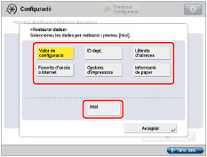 Si no restaureu dades per a [Valor de configuració] i [Llibreta d'adreces] al mateix temps, pot ser que les opcions de [Opcions env. URL] a [Establir bústia de fax/I-fax] i [Opcions de bústia] s'esborrin. |