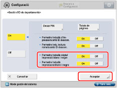Si l'opció <Permetre treballs còpia/impr. blanc i negre> està activada, [Còpia/Impressió en blanc i negre] apareix a la pantalla perquè entreu l'ID i el PIN de departament.