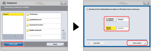 [PIN admdor. del sistema]: | Premeu [PIN admdor. del sistema] → premeu [PIN] → introduïu caràcters numèrics (màxim set dígits) per al PIN del sistema amb - (tecles numèriques). Premeu [Confirmar] → introduïu el mateix número per confirmar el PIN → premeu [Bé].Encara que introduïu menys de set dígits, s'afegeixen zeros a l'inici del número i s'estableix un número de set dígits. No obstant això, els zeros a l'inici del número es poden ometre en iniciar sessió. Per exemple, encara que introduïu <2>, <02> o <002>, el PIN s'estableix com a <0000002>. No obstant això, podeu iniciar sessió introduint <2>, <02> o <002>. No podeu registrar cap identificador d'administrador ni cap PIN del sistema que només tingui zeros, com ara <0> o <00>. |