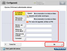 [Informació de contacte]: | Premeu [Informació de contacte] → introduïu la informació de contacte per a l'administrador del sistema → premeu [Bé]. |