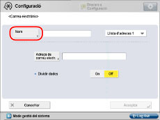 Si la mida de les dades que envieu supera el valor establert a l'opció [Mida màxima de dades per enviar] a [Opcions de funcions] (Configuració), les dades es dividiran quan s'enviïn. Si la mida de les dades que envieu supera el valor establert a l'opció [Mida màxima de dades per enviar] quan l'opció Dividir dades està desactivada, les dades es dividiran per pàgines i s'enviaran en diversos correus electrònics.