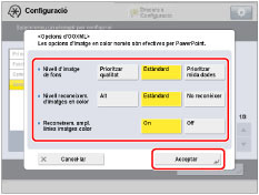 [Estàndard]: | La mida de les dades i la qualitat de la imatge de fons estan entre [Prioritzar mida dades] i [Prioritzar qualitat]. |