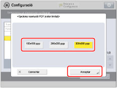 Aquesta opció només és vàlida quan el format de fitxer s'estableix com a [PDF (color lim.)] a "Llegir i enviar" o "Llegir i desar." Aquesta opció és vàlida quan se selecciona [Text] a [Tipus d'original], encara que seleccioneu [Prioritzar qualitat] a [Nivell qual. imatge per Color lim./Compacte]. (Vegeu "Nivell de qualitat d'imatge amb alta compressió/color limitat".) |