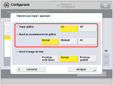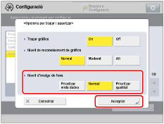Si augmenteu el <Nivell de reconeixement de gràfics>, la mida de les dades també augmentarà. Es recomana que primer useu [Normal] i, si no obteniu els resultats desitjats, intenteu augmentar el nivell de reconeixement de [Moderada] o [Alt]. |