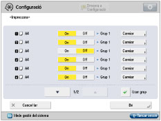 [Usar grup]: | Si ho poseu en "On", els orígens del paper s'establiran com un grup. Quan l'origen de paper especificat a la impressora es queda sense paper durant un la impressió, l'equip selecciona automàticament un altre origen de paper del mateix grup i continua imprimint. |