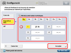 Si seleccioneu [Cada dia], seleccioneu un número (d'[1] a [5]) → introduïu l'hora de finalització amb