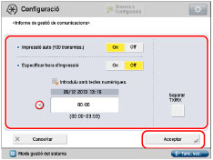 L'informe de gestió es pot imprimir automàticament o manualment. L'informe de gestió s'imprimeix automàticament quan el nombre de comunicacions arriba a 100, o a l'hora especificada. També es poden imprimir registres d'enviament i recepció per separat.