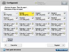 Podeu desar tipus de paper si els tipus de paper del paper que heu carregat no es mostren a la llista de configuració detallada. Per obtenir instruccions sobre com desar tipus de paper, vegeu " Descripció d'aquesta funció". Mentre deseu el tipus de paper personalitzat per a un origen de paper, les opcions de tipus de paper estan protegides i no podeu canviar la informació detallada per al tipus de paper personalitzat ni eliminar el tipus de paper personalitzat a [Opcions de gestió de tipus de paper] a [Preferències] (Configuració). |