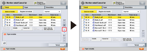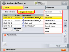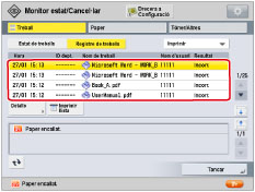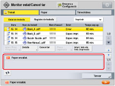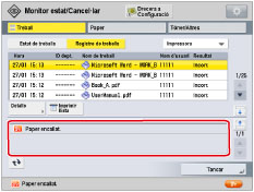 El treball cancel·lat apareix com a <Incorr.> (incorrecte) a la pantalla Registre. Si el paper especificar en el moment en què es va emetre un treball no està disponible, apareixerà un missatge que us demana que carregueu el paper adequat. Carregueu el paper i repreneu el treball. Si s'activa l'opció [Temps per a treballs suspesos] a [Opcions de funcions] (Configuració), el treball suspès perquè no hi havia paper disponible per imprimir apareixerà com a suspès quan hagi transcorregut el temps especificat. Per reprendre la impressió del treball suspès, carregueu el paper especificat → seleccioneu el treball → premeu [Detalls] → [Reprendre]. |