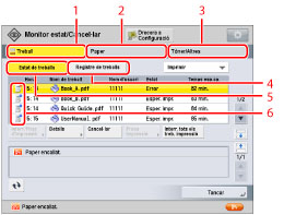 , apareixerà la pantalla del menú Monitor estat/Cancel·lar. En aquesta pantalla, podeu canviar l'ordre dels treballs, cancel·lar treballs i confirmar informació detallada sobre l'estat del treball i el registre de treballs. També podeu obtenir informació detallada sobre consumibles.