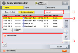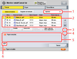 1 | Llista desplegable Tipus de treball Permet ordenar els treballs visualitzats per tipus de treball. Seleccioneu el tipus de paper següent. Imprimir Còpia Enviar Reenviar |