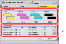 1 | Informació de tòner Podeu comprovar la quantitat restant de cada tòner de color ràpidament. |