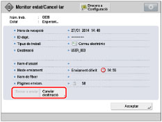 [Tornar a enviar]: | Reenvia el treball. Si seleccioneu un treball amb diverses destinacions, premeu [Llista de difusió] → seleccioneu la destinació on vulgueu reenviar el treball → premeu [Tornar a enviar]. |