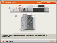 Si es produeix un encallament de grapes, apareix una pantalla on se n'indica la ubicació i com eliminar-lo a la pantalla tàctil. Seguiu les instruccions de la pantalla per treure l'encallament de grapes. La pantalla es mostra repetidament fins que elimineu l'encallament de grapes. Si premeu [Tancar], podeu seguir realitzant determinades tasques, com configurar un mode o llegir originals, encara que no traieu immediatament l'encallament de grapes.
