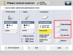 Pokud pro přední předsádku, zadní předsádku nebo vkládané listy nastavíte jinou velikost papíru, velikosti papíru pro ostatní funkce se automaticky změní na novou velikost papíru. Po změně zdroje papíru pro určitou funkci na zdroj se stejnou velikostí papíru se však nezmění nastavení pro ostatní funkce. Před podáváním papíru z Document Insertion Unit-N uložte papír do Document Insertion Unit-N a zadejte velikost papíru. Chcete-li podávat papír z Document Insertion Unit-N, vyberte [Ukladač listů 1] nebo [Ukladač listů 2]. Jestliže se papír pro aktuálně zpracovávanou úlohu podává z Document Insertion Unit-N, stisknutím [Změna/Vložit pap. 1] nebo [Změna/Vložit pap. 2] vyberte papír pro vkládané listy. |