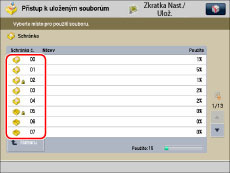 Vybrané soubory jsou číslovány v zadaném pořadí a v tomto pořadí se vytisknou. Výběr souboru můžete zrušit jeho opětovným výběrem. Chcete-li výběr všech souborů zrušit, stiskněte [Zrušit výběr]. ([Zrušit výběr] se změní na [Vybrat vše (Max. 100 soub.)].) Je-li v uživatelské schránce uloženo dva a více souborů, můžete stisknutím tlačítek [Název] nebo [Datum/Čas] soubory setřídit. Pokud po setřídění souborů schránku zavřete, budou soubory při dalším otevření schránky opět nesetříděné. Bude-li soubor do schránky uložen z počítače nebo smažete-li soubor ze schránky až po setřídění souborů, aktualizovaný seznam zůstane setříděný. Stisknete-li po výběru souboru [Název] nebo [Datum/Čas], výběr souboru se zruší a zobrazí se začátek seznamu souborů. |