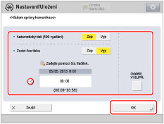 Chcete-li, aby se hlášení tisklo v zadaný čas, stiskněte [Zap] → zadejte čas pomocí