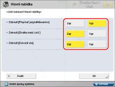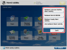 Pro obrazovku Hlavní nabídka můžete nastavit zobrazení tlačítek přímého přístupu (klávesových zkratek) pro režimy, jako je např. změna jazyka displeje nebo změny nastavení papíru pro kopírování či tisk.