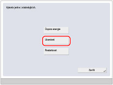 Stroj může přijímat a tisknout dokumenty z osobního počítače, i když se nachází v režimu spánku. Stejně tak může v klidovém režimu přijímat I-faxové dokumenty. Stroj můžete vypnout také přes vzdálené uživatelské rozhraní, a to pomocí režimu vzdáleného ukončení. Další informace viz v části „Vypnutí stroje ze vzdáleného UR.“ Pro vypínání stroje můžete také používat režim automatického ukončení. Další informace viz v části „Čas do automatického vypnutí.“ |
