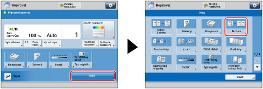 Tento režim umožňuje kopírovat jednostranné nebo oboustranné originály tak, že se z kopií zhotoví brožura.