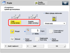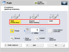 Informace o volitelných produktech najdete v následujících částech: Není-li nastavena volba [Kompletace], pak se listy na výstup podají stejným způsobem, jako když je nastavena volba [Skupina (Stejné stránky)]. Je-li volba [Automatické třídění] nastavena na Zap, po uložení originálů do podavače se automaticky nastaví režim Třídit nebo Přesah Třídit. (Viz „Zapnutí automatického třídění.“) Stisknutím tlačítka [Detaily] zobrazíte podrobné informace o vybraném papíru. |