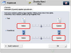 Chcete-li, aby se text nebo čáry kopírovaly výrazně, mělo by nastavení pro oblast textu být blíže k nastavení [Vysoká]. Při kopírování originálů obsahujících tištěné fotografie nebo jiné polotóny zadejte pro oblast Foto/Obraz nastavení blíže k [Nízká].