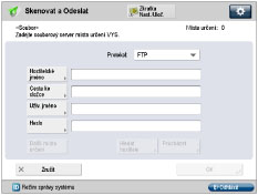 Chcete-li používat plný název počítače jako jméno hostitele pro [Hostitelské jméno], jak je uvedeno v příkladu výše, je nezbytné používat DNS server. (Toto platí, i když jsou stroj a FTP server ve stejné podsíti.) Není-li DNS server k dispozici, nastavení pro [Hostitelské jméno] musí být zadáno s použitím IP adresy FTP serveru. Pro [Hostitelské jméno] lze zadat až 128 alfanumerických znaků na ovládacím panelu. Pro [Cesta ke složce] lze zadat až 255 alfanumerických znaků. Zadejte nastavení serveru v rámci limitů znaků. Změníte-li jazyk displeje dotekového panelu, může se stát, že se [Hostitelské jméno] a [Cesta ke složce] nezobrazí správně. Chcete-li odesílat na IPv4 hostitele s pomocí jiného FTP portu, než je port 21, nastavte [Hostitelské jméno] s použitím následujícího formátu: <IPv4 adresa FTP serveru>:<Číslo portu> Příklad: 192.168.1.21:21000 Chcete-li odesílat na IPv6 hostitele, nastavte [Hostitelské jméno] s použitím následujícího formátu: <IPv6 adresa>:<Číslo portu> Příklad: [5aed:90a0:bc05:01d2:568a:2fc0:0001:12ee]:21000 |