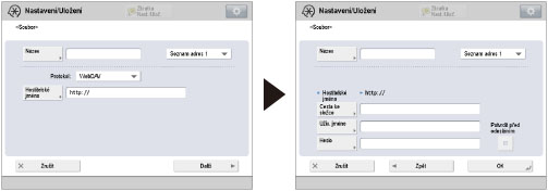 Pro [Hostitelské jméno] lze zadat až 128 alfanumerických znaků na ovládacím panelu. Pro [Cesta ke složce] lze zadat až 255 alfanumerických znaků. Zadejte nastavení serveru v rámci limitů znaků. Změníte-li jazyk displeje dotekového panelu, může se stát, že se [Hostitelské jméno] a [Cesta ke složce] nezobrazí správně. Jestliže se jazyk na displeji dotekového panelu liší od počítače používaného jako hlavní prohlížeč (master browser), může se stát, že se [Hostitelské jméno] a [Cesta ke složce] nezobrazí správně nebo nebudete moci procházet adresáři. Chcete-li odesílat na IPv6 hostitele, nastavte [Hostitelské jméno] s použitím následujícího formátu: <IPv6 adresa>:<Číslo portu> Příklad: [5aed:90a0:bc05:01d2:568a:2fc0:0001:12ee]:21000 |