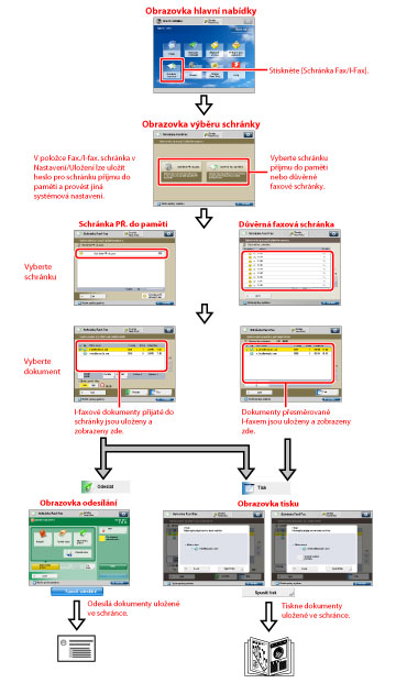 Pokud obrazové soubory připojené k přijatým I-faxovým dokumentům nejsou kompatibilní s tímto strojem, stroj tyto soubory nezpracuje (tisk, přesměrování nebo uložení). Namísto toho je smaže. V takovém případě se s textem přijatého l-faxu vytisknou názvy smazaných souborů a hlášení <Žádný program nemůže zpracovat soubor v příloze.>. Pro uvolnění paměti pro ukládání nových souborů doporučujeme z faxové/I-faxové schránky odstranit nepotřebné soubory a obrazová data. |