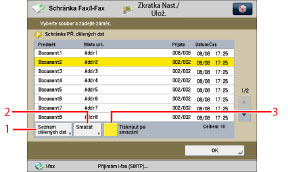 1 | Vybrat vše (Max. 32 soub.)/Zrušit výběr Stiskněte, chcete-li vybrat všechny soubory ve schránce. Po výběru dokumentu se toto tlačítko změní na [Zrušit výběr]. |