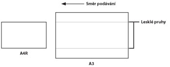 Je-li po kopírování nebo tisku 100 či více listů papíru s kratší šířkou použit papír s delší šířkou (např. použijete-li papír A3 po A4R), na obou okrajích ve směru podávání se mohou objevit lesklé proužky. Na potištěném silném nebo potaženém papíru se navíc mohou objevit fleky s nestejnorodým leskem. Pokud tomu tak je, zobrazení lesklých proužků a míst s nerovnoměrným leskem lze potlačit obnovením fixačního válce a očištěním jeho povrchu.