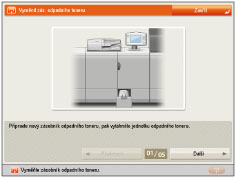Kompletní postup pro výměnu zásobníku odpadního toneru vyvoláte stisknutím tlačítka [Předchozí] nebo [Další] na displeji dotekového panelu. Je-li třeba zásobník odpadního toneru vyměnit během zpracovávání tiskové úlohy, zbylé tisky se dokončí po nainstalování nového zásobníku odpadního toneru. Zásobník odpadního toneru lze vyměnit za chodu stroje. |