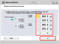 [F]: | Zadejte naměřenou délku značky „f“ na testovací stránce (pro dlouhé listy: Zadejte vstupní hodnotu vypočítanou z naměřené délky značky „f“ na testovací stránce dlouhého listu. Vstupní hodnota = ((výchozí hodnota „f“: 360 mm) / (naměřená pozice „f“: 450, 550, 650 mm)) x naměřená hodnota „f“). |
