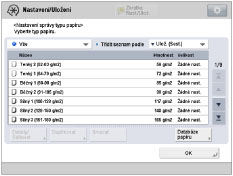 Upravovat lze pouze typy papíru uložené uživatelem. Detailní informace nelze změnit a typ papíru nelze smazat v následujících případech: Když je typ papíru aktuálně používán pro kopírovací/tiskové úlohy Když je typ papíru uložen pro zdroj papíru (Viz „Ukládání velikosti a typu papíru pro zdroj papíru.“) Když je typ papíru uložen jako papír určený k nastavení v [Uložit papír k nastavení] v [Autom. nastavení gradace] (Viz „Automatické nastavení gradace.“) Když je typ papíru uložen jako vzorek korekce v [Uložit vzorek korekce] v [Nastavení autom. korekce odstínu barev] (Viz „Automatická korekce barevných odstínů.“) Seznam typů papíru můžete třídit podle data uložení (Ulož. (Vzest.)/Ulož. (Sest.)), názvu (Jméno (Vzest.)/Jméno (Sest.)) nebo hmotnosti (Hmotn. (Vzest.)/Hmotn. (Sest.)) z rozevíracího seznamu pro třídění seznamu. |