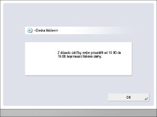 Jelikož [OK] se na displeji nezobrazuje, tuto desku hlášení může zavřít pouze administrátor (správce). Když se zobrazí tato deska hlášení, nemůžete na stroji provádět operace. Tato deska hlášení je nejvhodnější, když chcete dočasně zastavit provádění operací na stroji. | |