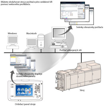 Vzdálené UR umožňuje pozastavit a obnovit zpracování úloh, provádět operace s úlohami ve schránce příjmu do paměti nebo v důvěrných faxových schránkách a zadávat různá nastavení. S jeho pomocí můžete nastavovat a řídit provoz stroje z počítače, namísto abyste pro tyto úkony používali ovládací panel stroje.