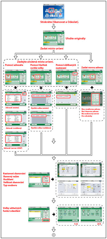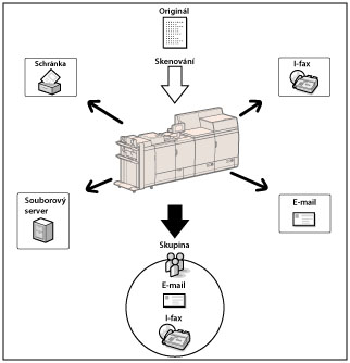 Aby bylo možné odesílat naskenované dokumenty na e-mailovou, I-faxovou adresu nebo na souborový server, musíte nejdříve zadat síťová nastavení. (Viz „Běžná nastavení komunikace pro e-mail/I-fax.“) |