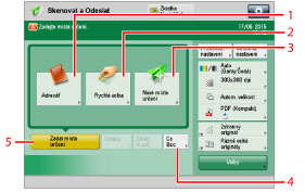 2 | [Rychlá volba] Stisknutím tohoto tlačítka vyvoláte obrazovku pro ukládání/zadání tlačítek rychlé volby (tlačítek volby na jeden dotek). Stiskněte [Na vzdál. adresář] chcete-li zadat místa určení uložená v tlačítkách na jeden dotek serverového stroje prostřednictvím přístupu z klientského stroje v síti. Další informace viz v části „Zadání míst určení z tlačítek volby na jeden dotek serverového stroje.“ |