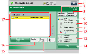 14 | [Volby] Stiskněte, chcete-li pro skenování a odesílání vybrat a použít další dostupné režimy. Slouží k nastavení praktických funkcí pro odesílání, jako např. odesílání různě velkých originálů v jedné dávce nebo oboustranných originálů. |