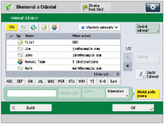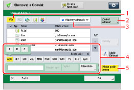 4 | Tlačítko pro hledání podle počátečního písmena Stisknutím alfanumerických tlačítek (např. [ABC]) zobrazíte jednotlivá tlačítka pro každé písmeno nebo číslo. Výběrem písmena nebo čísla můžete omezit rozsah zobrazených položek. Stisknutím [Vše] se vrátíte na úplný seznam adres. |