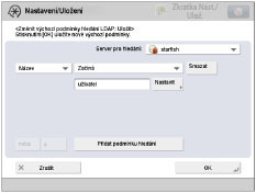 Liší-li se nastavení času ve stroji od nastavení času serveru o více než 5 minut, nelze provést hledání místa určení prostřednictvím serveru LDAP. Nedaří-li se vám provést hledání ani po zadání správného uživatelského jména a hesla, zkontrolujte nastavení času na serveru a na stroji. Počet zobrazených výsledků hledání nepřesáhne maximální limit nastavený v [Server LDAP]. Jestliže se požadované místo určení nezobrazí, zvyšte maximální počet adres k hledání nebo změňte kritéria hledání. (Viz „Nastavení serveru LDAP.“) |