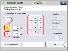 Stiskněte [X] and [Y] → pomocí číselných tlačítek zadejte velikost skenování v mm → stiskněte [OK].