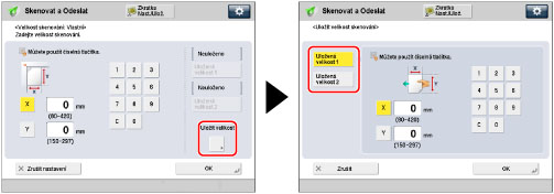 Pro skenování originálů, které stroj nedokáže detekovat s pomocí režimu [Autom. velikost], můžete zadat velikost skenování ručně. Zadanou velikost skenování můžete také uložit.