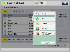 Stisknete-li tlačítka jako [ABC], [DEF] a [GHI] na obrazovce adresáře, použije se prvně zadaný znak jména k vyhledávání v seznamu míst určení. Stisknete-li tlačítko [Hledat podle jména] na obrazovce adresáře, zobrazí se obrazovka pro zpřesnění vyhledávání v adresáři. |