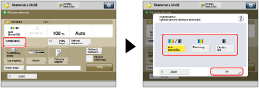 Pokud naskenujete černobílý originál v režimu Plné barvy, počítá se jako barevné skenování. Požadovaný barevný režim můžete uložit jako výchozí nastavení, a to tak, že změníte výchozí nastavení skenování. (Viz „Zadání nastavení funkce Skenovat a Uložit.“) |