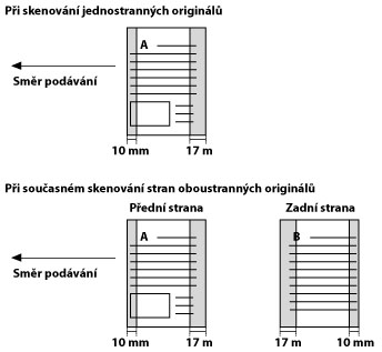 Výchozí nastavení je Auto (Barvy/ČB). Je-li nastavena volba [Auto (Barvy/ČB)] a na originálech jsou barevné oblasti, stroj je naskenuje v režimu Plné barvy. Může se však stát, že za níže uvedených podmínek stroj naskenuje barevné originály v režimu Č/B. Zabráníte tomu, nastavíte-li barevný režim na [Plné barvy]. Je-li na originálech velmi malé množství barevných oblastí. Jsou-li barevné oblasti téměř černé Je-li sytost barev na originálech nízká. Jsou-li barevné části umístěny pouze v oblasti označené v níže uvedeném schématu, když ukládáte originály do podavače. ![]() |
