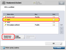 Na stroji je nainstalován pár klíčů a serverový certifikát. Tento pár klíčů a serverový certifikát můžete použít pro provádění šifrované komunikace TLS. Název předinstalovaného páru klíčů je „Default Key“. Stisknete-li [Detaily certifikátu], můžete certifikát zkontrolovat. Stisknete-li [Zobrazit místo použití], můžete zkontrolovat, pro co je klíč používán. |